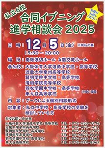 入試関連情報 2025.09.17 合同イブニング進学相談会2025のお知らせ 「合同イブニング 進学相談会2025」に本校が参加させていただきます。 日時:12月5日(金) 15:30~20:00 場所:南海浪切ホール 4階交流ホール 内容:ブースによる個別相談形式 私立6校が合同で行います。お気軽にお越しください。 NEWS一覧に戻る カテゴリ一 重要なお知らせお知らせ学校行事部活動事務室より海外研修入試関連情報学校長メッセージ