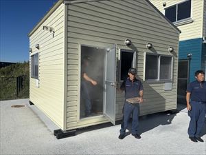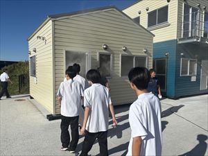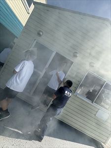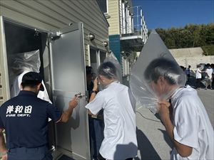 その後は、隣接する訓練用住宅に移動し、煙の中での避難訓練を実施しました。煙は人体に害のない人工的なもので再現されており、視界がほとんど効かない中での避難行動を体験しました。1回目は何も装着せずに、2回目は口に空気を入れたビニール袋を当てて、3回目はビニール袋を頭からかぶり顔全体を覆って避難。段階的な訓練を通して、煙の怖さや避難時の姿勢・判断力の重要性を学ぶことができました。