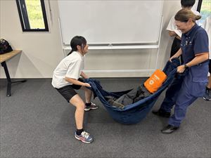 それぞれの方法について、訓練用のぬいぐるみを用いながら実際に搬送の練習を行い、協力しながら安全に運ぶコツを体験的に学ぶことができました。