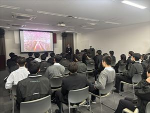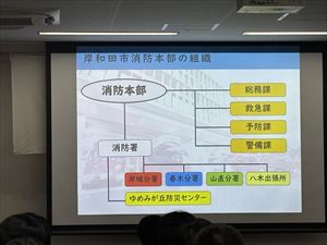 授業終了後に学校を出発し、参加生徒全員が防災センターに集合して活動が開始されました。今回の研修では、岸和田消防の業務内容や消防士の仕事内容、給与、勤務形態などについて説明を受け、消防という職業や地域防災の重要性について理解を深めました。また、防災に関する情報発信の一環として、消防本部の公式SNSを通じて防災知識を広める取り組みにも協力しました。