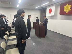 講義後には、今年度1年間にわたって取り組んできた学生消防サポーター活動の修了式が行われました。消防長の出席のもと、参加した生徒を代表して修了証が授与され、本活動が一区切りを迎えました。