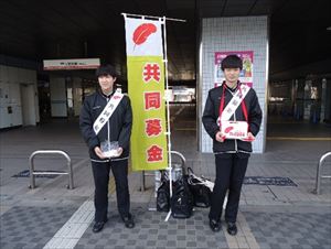 12/18(木)午後、高校3年生8名は、岸和田社会福祉協議会のご協力のもと、南海岸和田駅前とJR東岸和田駅前の2か所で「赤い羽根共同募金」の活動に参加しました。 開始当初はすこし緊張し、声も小さいものでしたが、こちらに気づいて財布を取り出し駆け寄ってくださる人が出てくるにつれて、生徒たちのこわばった表情が笑顔に変わり、「ご協力よろしくおねがいします!」との快活な声が響くようになりました。