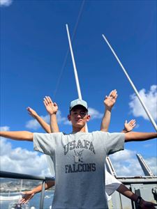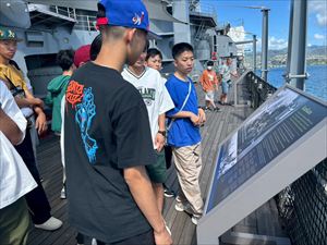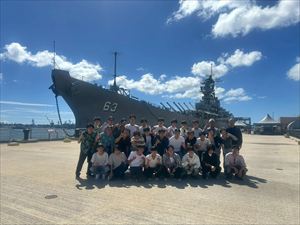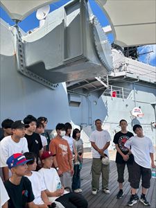 船に近づくと、その船体の巨大さや各所の砲門の大きさに生徒たちも驚き、感心していました。岸壁から階段をつたって甲板に上り、ガイドの方の案内がありましたが、生徒たちは熱心に耳を傾けて聴いていました。ミズーリの舷側にはその時に出来たへこみが残っており、また水葬の際の儀式の様子が分かる表示を見ながら、生徒たちは艦を降りました。
