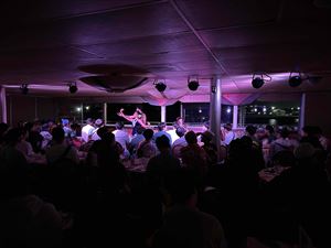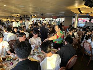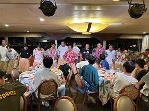 ハワイ産の野菜やアメリカ産の牛肉をビュッフェスタイルで楽しんでいるうちに、フラのレッスンの時間となりました。多くの生徒がフラを体験してみようとステージに集まりました。