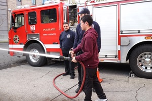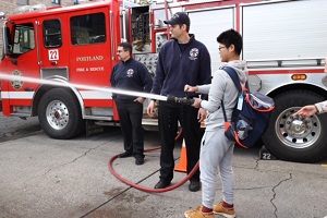 最初に、彼らが「巨大な道具箱」と称する消防車の説明を受けました。想定され得る様々な現場に備えて、大きなチェーンソーや、カッターなどが入っているそうです。また、車の前後に運転席があり、前輪を操る人、後輪を操る人に分かれ一台の車を運転するとのことでした。次に署内の談話室、コンピュータ室、トレーニングルームなど色々な施設等も見学させてもらい、最後には放水体験もさせていもらいました。