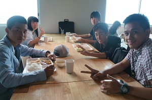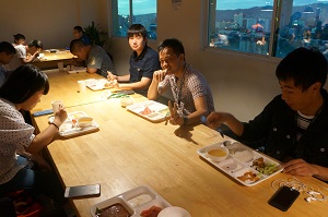 午前のレッスン後は昼食を食べました。メニューはライス、魚の天ぷら、炒麺、野菜サラダ、わかめスープでした。