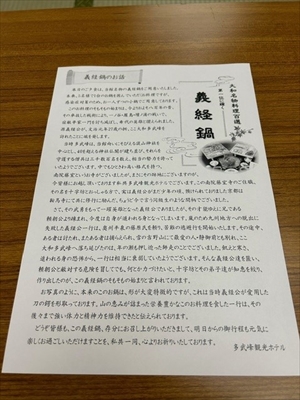 今日の夕食は多武峰観光ホテル名物の義経鍋です。義経鍋は、源義経が兄頼朝の追っ手から逃れた際、身を潜めた多武峰で食したといわれるお鍋のことです。