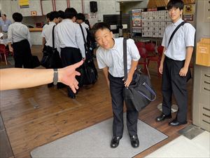 プログラムの前には近畿大学の屋木清孝先生も激励に来て下さり、生徒たちの気持ちも高まり、英語でのあいさつをお互いに確認しあっていました。英語村は足を踏み入れた瞬間から、日本語は一切話せません。ドアの前で一息つき、大きな声で「Hello!」とあいさつしながら英語村に入っていきました。