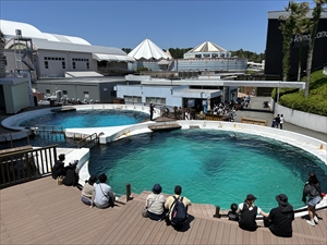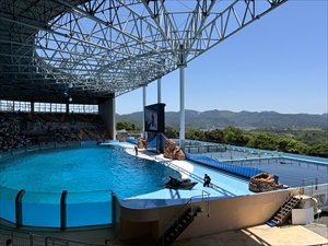 マリンライブ「Smiles」を見学した生徒は、バンドウイルカ、カマイルカ、ハナゴンドウ、オキゴンドウとトレーナーの皆さんが共演するライブパフォーマンスを堪能しました。