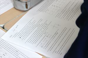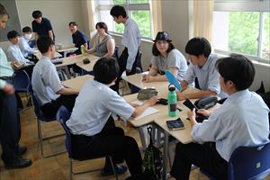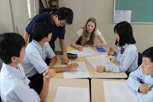 数学の授業では、英文で書かれた数学の問題を解くというグループワークです。