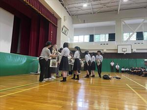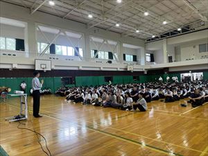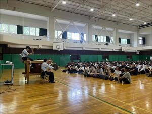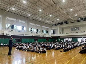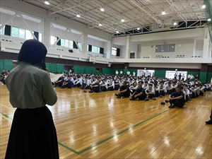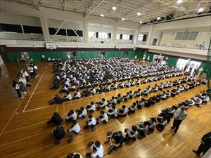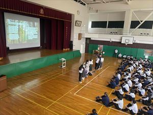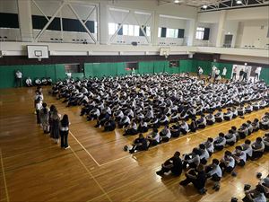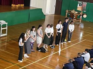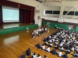 まずは、校長先生の英語での挨拶と生徒会長の歓迎の言葉で集会がスタートしました!
