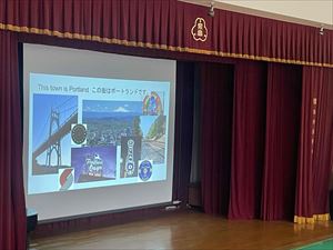 その後はルーズベルト高校の生徒の紹介です。9名のルーズベルト高校生それぞれが作ってきたスライド画像を用いて、自己紹介を行ってもらいました。中には、勉強してきた日本語を使って上手にスピーチをしている留学生もおり、本校の生徒たちも驚いている様子でした。